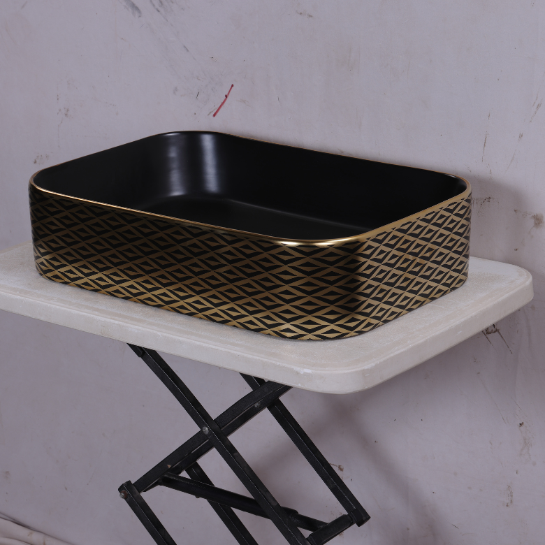 A premium matte black countertop basin featuring elegant gold geometric detailing, offering a modern, luxurious touch to contemporary bathrooms with durable ceramic craftsmanship.