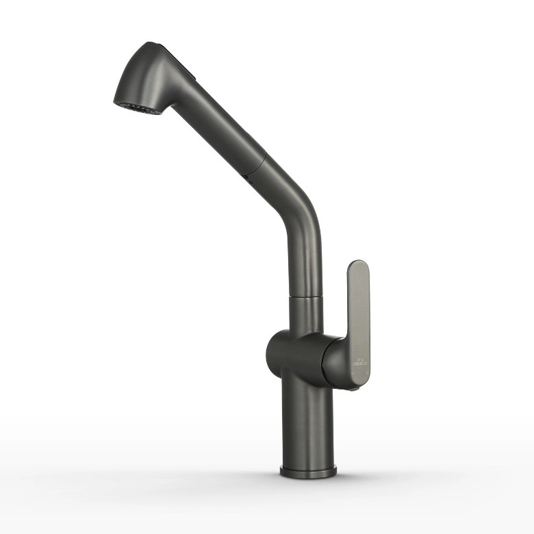 Compact modern faucet with a sleek Gunmetal Grey finish and an industrial profile. It features an ergonomic, pull-out spray wand and a prominent single lever for […]