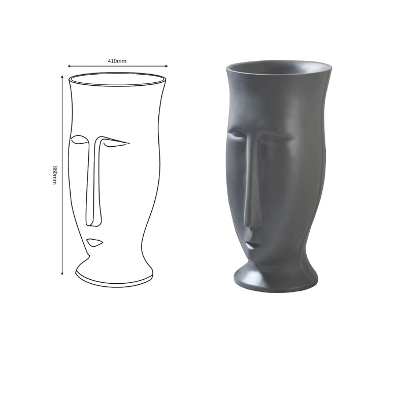 A unique face-shaped pedestal basin in matte grey, blending artistic sculpture with functional design for a striking, modern bathroom centerpiece.