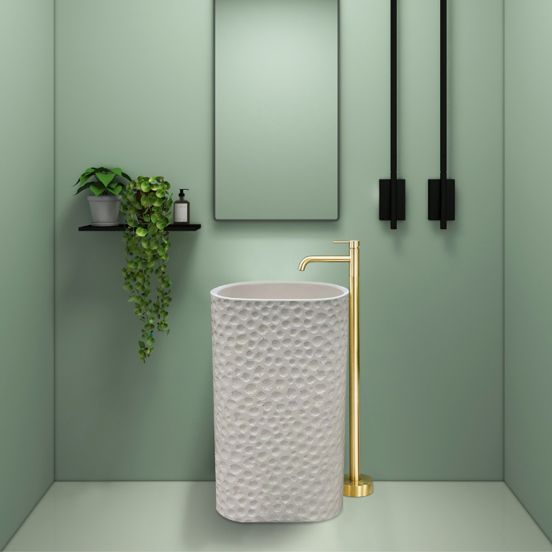 A beautifully textured white pedestal basin featuring a handcrafted pebble-like surface, paired with a sleek gold faucet for a refined, contemporary look that elevates any luxury […]