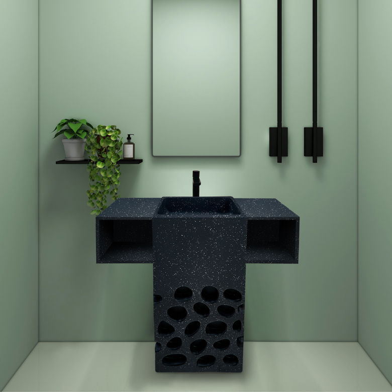 A bold black terrazzo pedestal basin featuring sculpted oval cut-outs and extended side shelves, delivering an architectural, contemporary statement for modern luxury bathrooms.