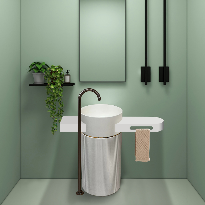 A refined pedestal basin featuring a ribbed cylindrical body, smooth matte bowl, and integrated floating shelf with towel holder combining modern utility with minimalist luxury.