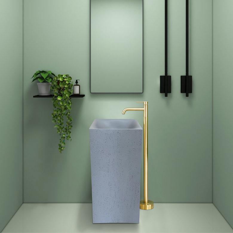 A sleek light-grey pedestal basin with a refined textured finish, offering modern elegance and minimalist charm for contemporary bathrooms seeking subtle sophistication.