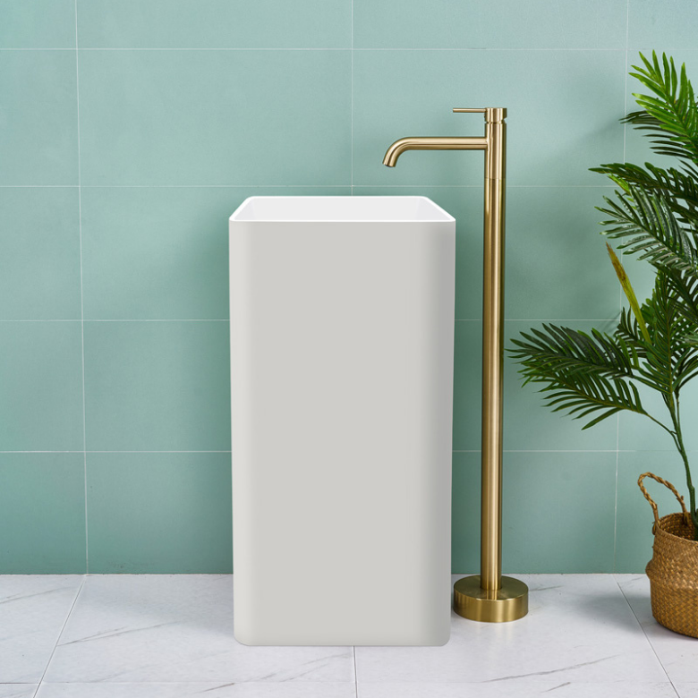 A sleek white pedestal basin with smooth, rounded edges, paired with a brushed gold faucet for a clean, modern, and luxurious look that elevates any contemporary […]