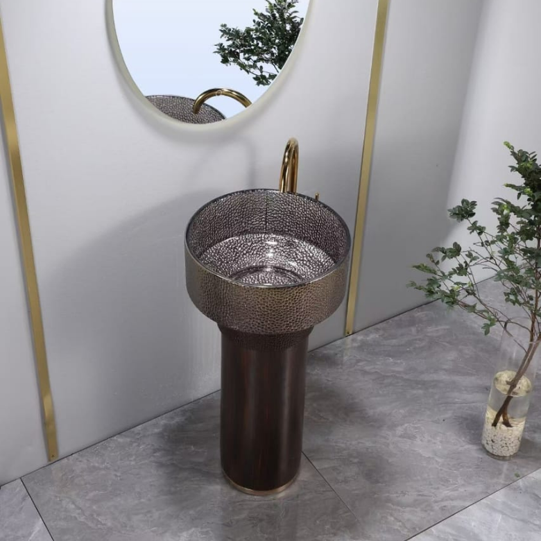 A stunning fusion of hammered metallic texture and rich wood tones, this pedestal basin brings artisanal luxury and modern elegance to contemporary bathrooms.
