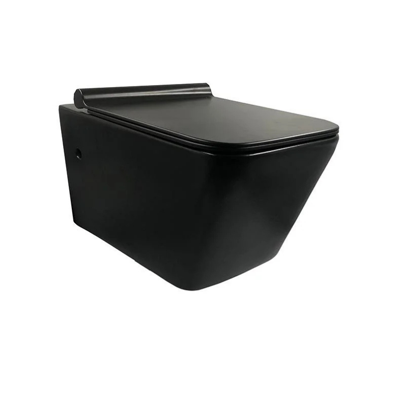 A modern matte black wall hung toilet with a sleek, bold design that brings elegance and minimalism to contemporary bathrooms.