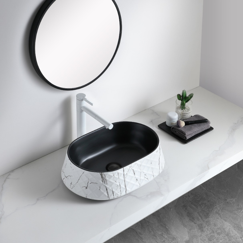 Contemporary oval basin featuring a white marble-patterned textured exterior and a contrasting solid matte black interior for high-end style.