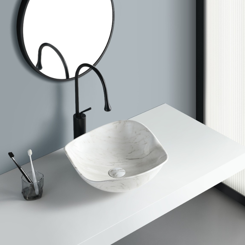 Elegant white oval basin featuring a soft wave rim and a subtle grey-marbled interior for a light, modern bathroom aesthetic.