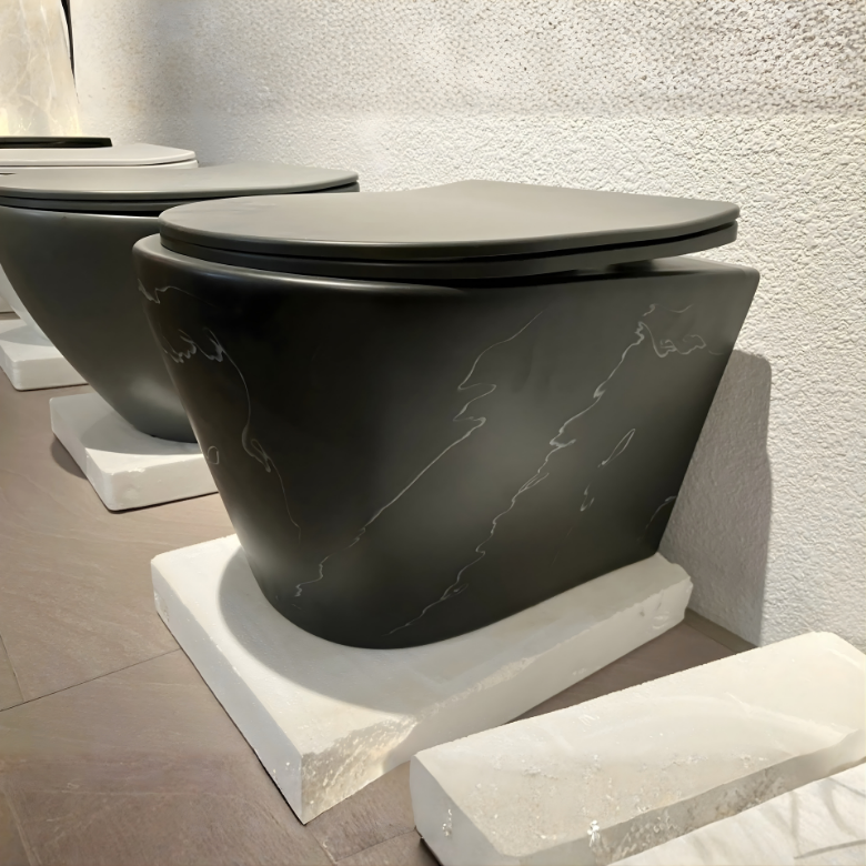 A sleek matte black toilet with subtle marble veining, offering a bold, modern aesthetic that elevates premium bathroom spaces with refined sophistication.